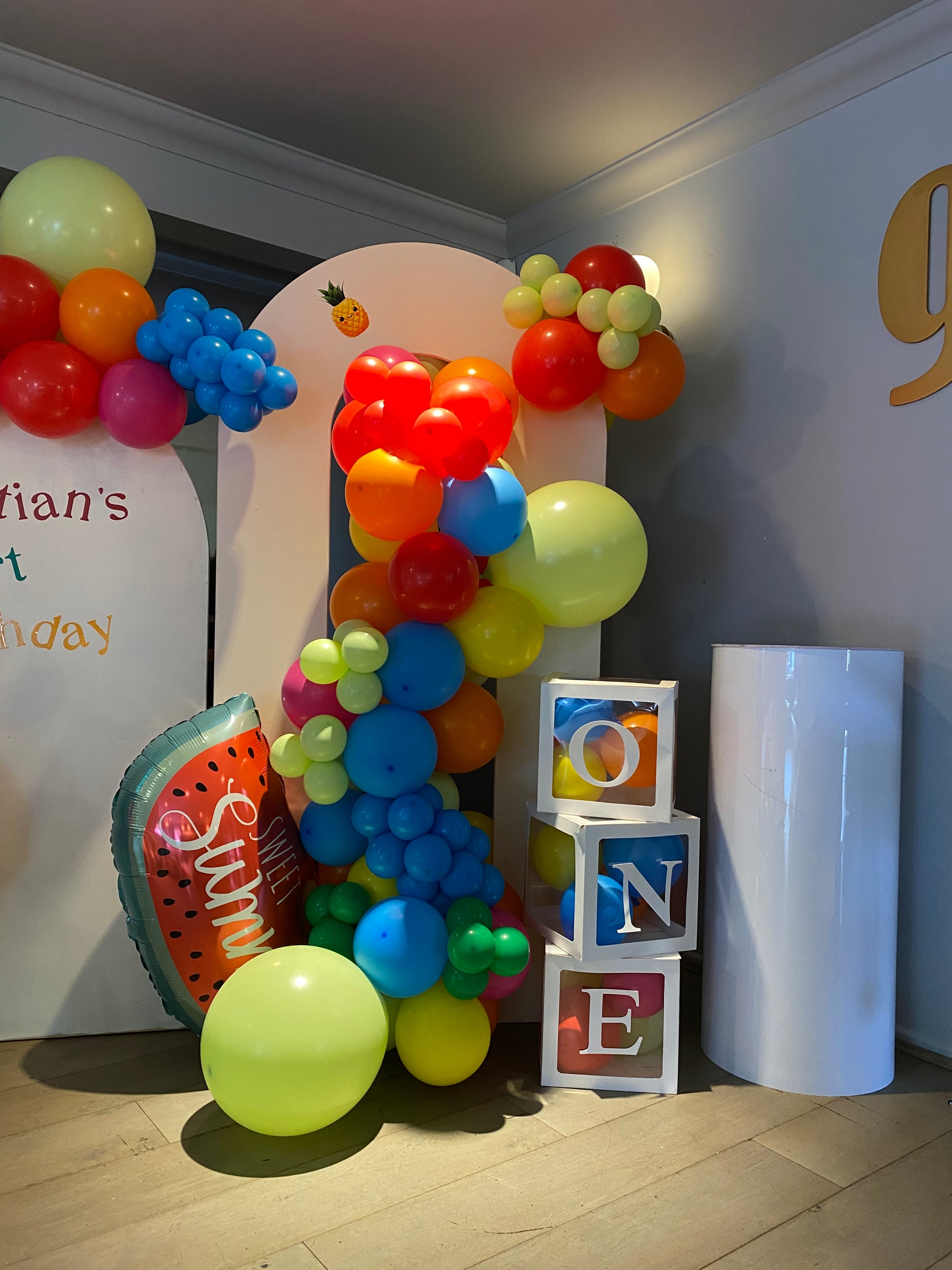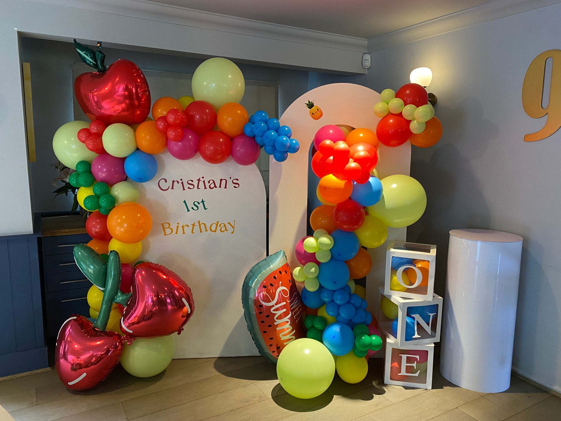 Beautiful balloon arch with 2 sailboards this wonderful dancing fruit theme with 3 foil fruit balloons, cake plinth and number One box.