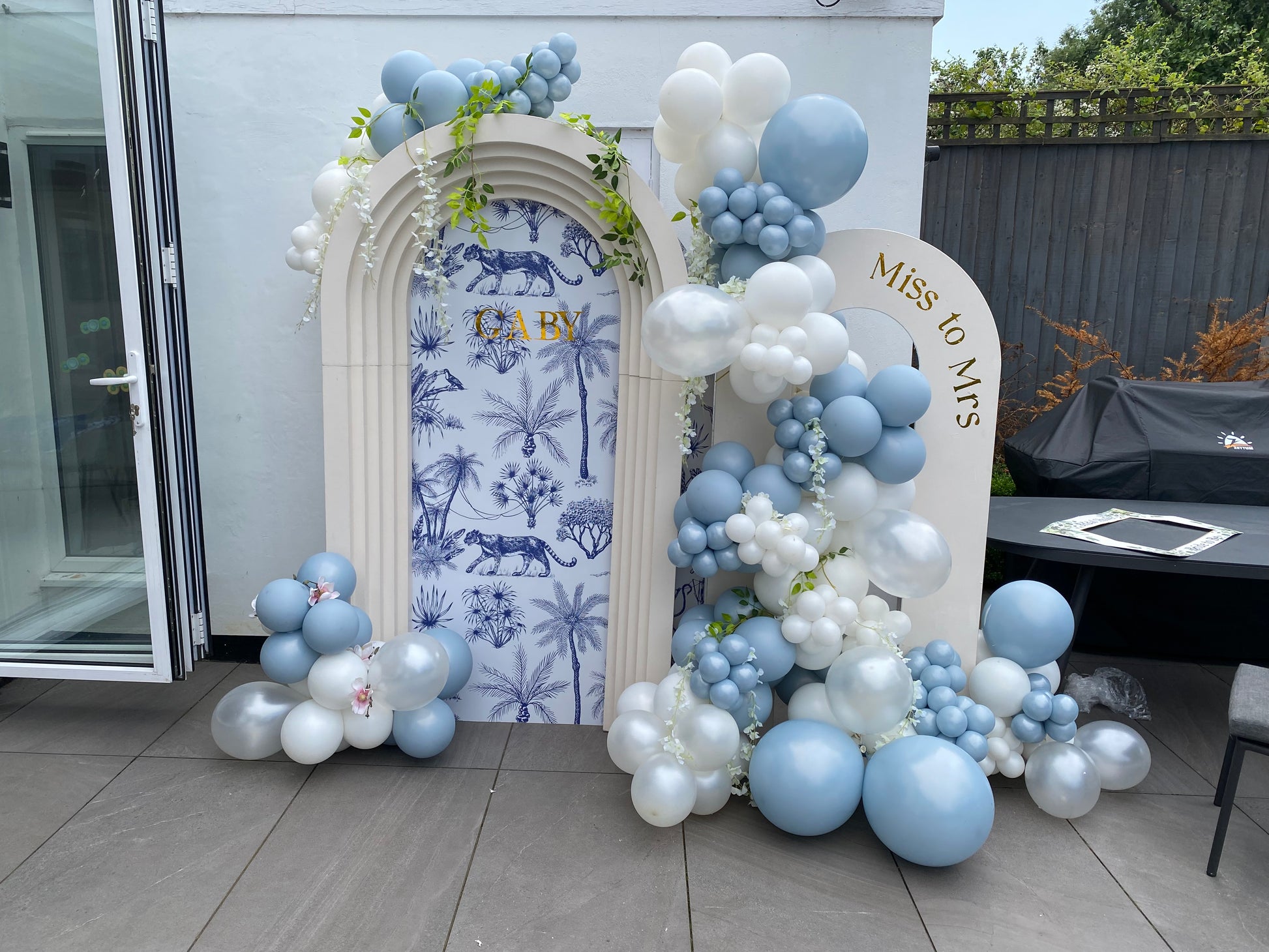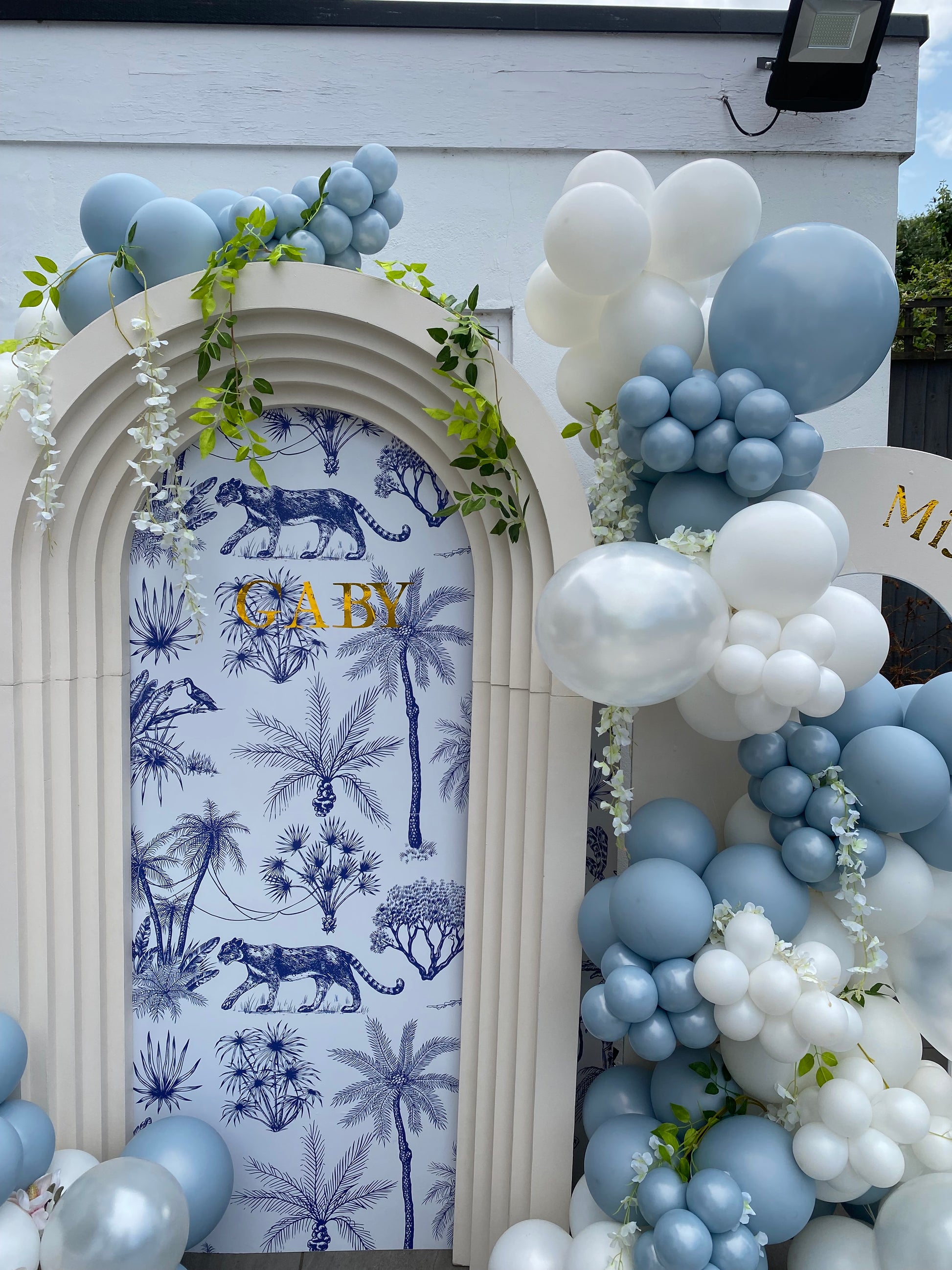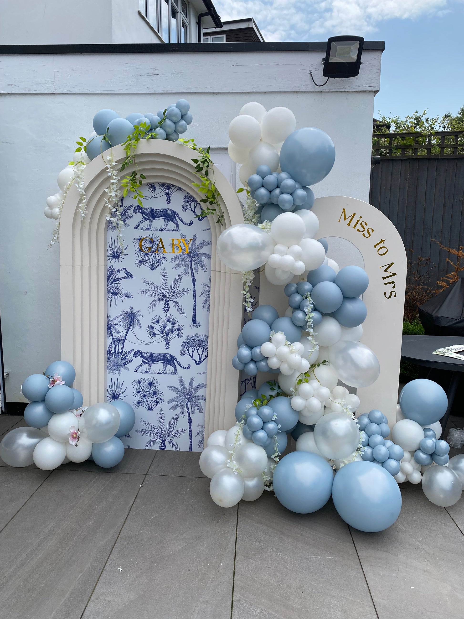 This beautiful balloon decor was created for a bride-to-be. We brought the elegance of Dior to life with a stunning arch featuring pearl white balloons seamlessly blending into the ocean blue hues of the Aura collection.